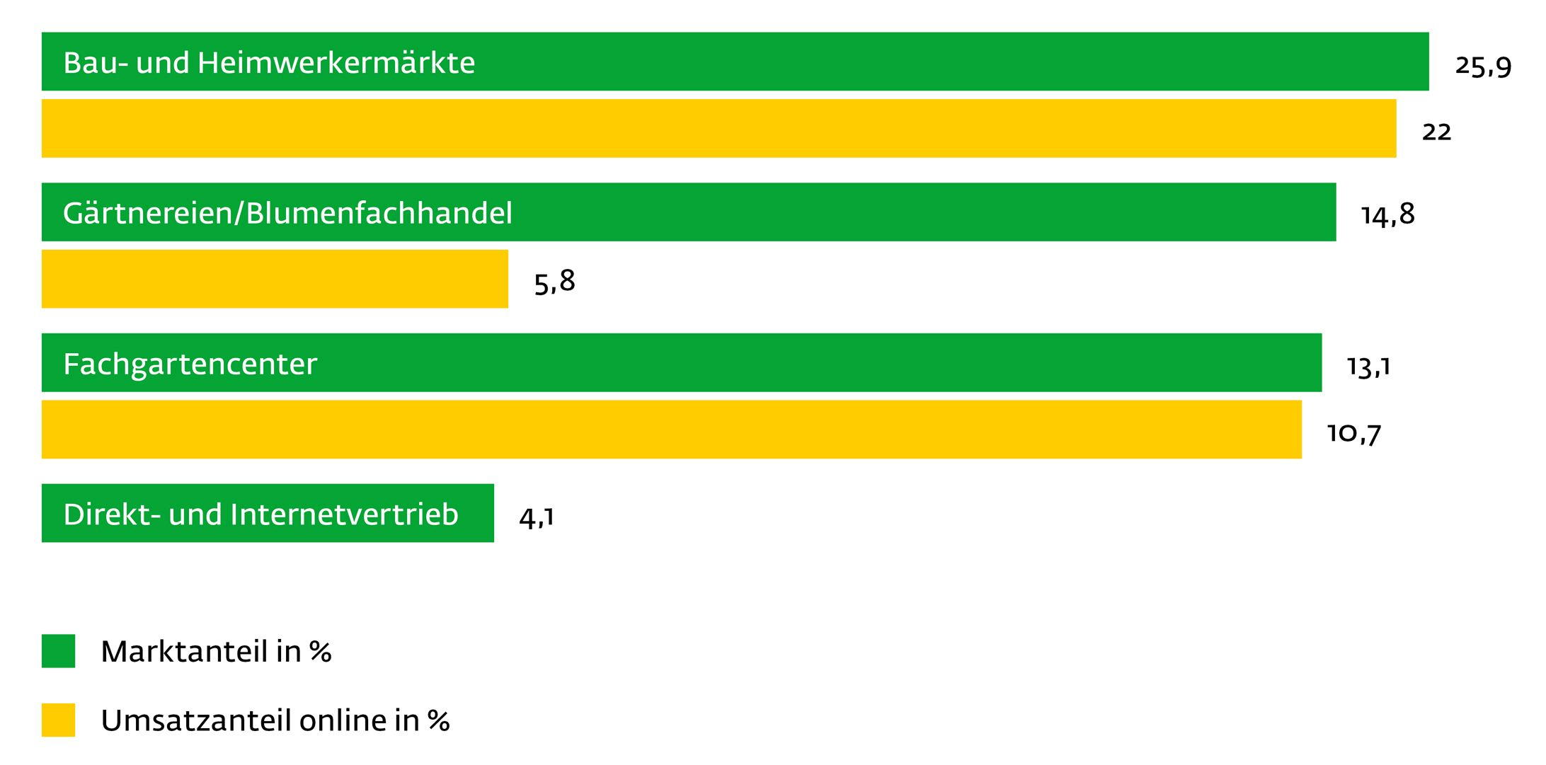 Im Folgenden stellen wir die wesentlichen Marktanteile der verschiedenen Vertriebswege im deutschen Gartenmarkt, wie vom Industrieverband Garten e.V. für 2019 eingeschätzt, dar. Die jeweils zugehörigen Umsatzanteile im Onlinebereich sind geringer, da der größte Teil des Online-Umsatzes mit knapp 39 % durch Internet Pure Player, Versandhandel Online oder Hersteller Online erzielt wird.