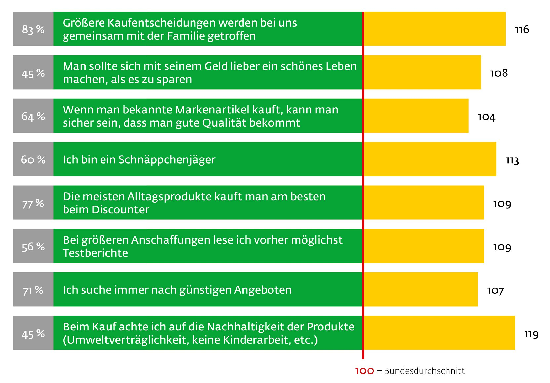 Gartenfreunde konsumieren gerne. Sie geben lieber Geld für schöne Dinge aus, als es zu sparen. Vor dem Kauf gehen sie allerdings auf Nummer sicher: Man vertraut eher Markenprodukten, liest Testberichte und bespricht sich mit der Familie.Hier einige Statements zum Thema Konsum, denen (voll und ganz/eher) zugestimmt wird. So sind sich z.B. 64 % der Kleingärtner sicher, dass sie beim Kauf von Markenartikeln auch  gute Qualität bekommen, womit sie 4 % über dem Bundesdurchschnitt liegen.