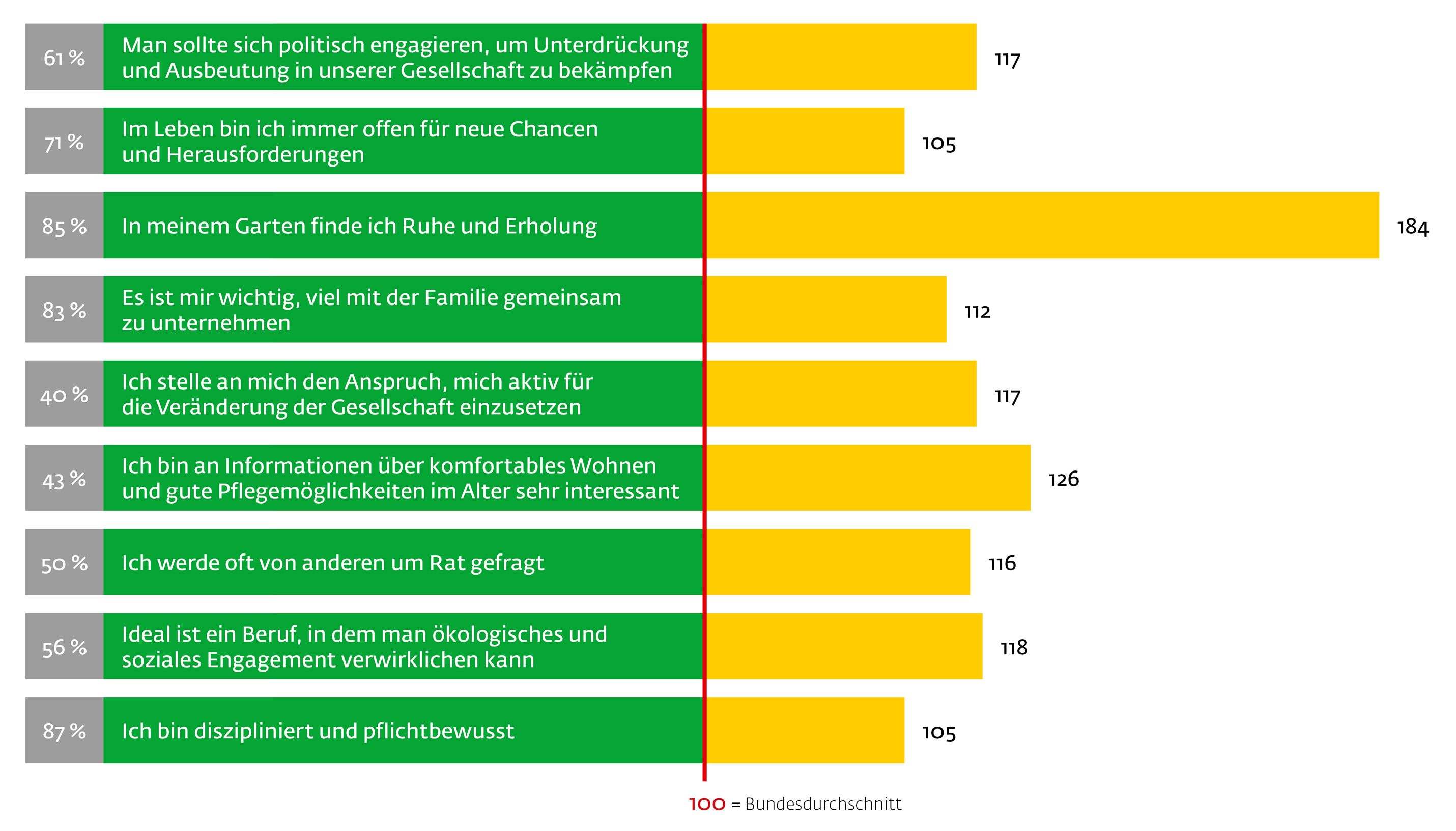 Gartenfreunde sind offen, tolerant und haben ein hohes gesellschaftliches  Engagement, politisch sind sie gerechtigkeitsorientiert. Hier einige Aspekte des Lebens, die den Kleingärtnern besonders wichtig  bzw. wichtig sind. Die Verhältnismäßigkeit zeigt die Abweichung vom Index  (z.B. kulturelles Leben mit Index 119).