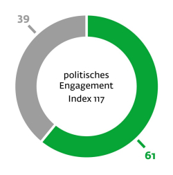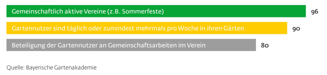 Der Kleingarten ist ein kommunikativer Rückzugsort. Hier kann man allein Ruhe und Erholung finden oder mit anderen Menschen zusammenkommen und sich austauschen. Die Anziehungskraft des Gartens weitet sich natürlich auch auf die Familie und Freunde aus. Statistisch kommen auf jeden Kleingärtner mehr als vier weiter Nutzer des Gartens (Nennung in %).