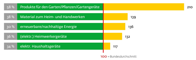Die Kleingärtner halten einen deutlich überdurchschnittlichen Bestand an Heimwerker-geräten im Haushalt vor, hier eine Auswahl der deutlichsten Abweichungen zum Schnitt (= 100) mit prozentualer Häufigkeit der Nennung: